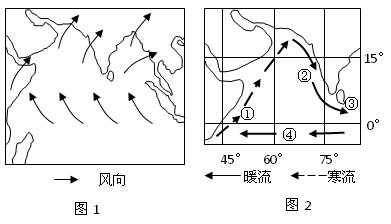 1、单选题 下图是印度洋(局部)季风(图1)和洋流(图2)示意图,读图回答1—2题。