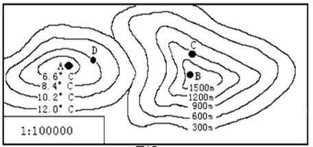 (1)从图中可以看出,300米等高线的温度为12°C,C点海拔高度为1200米,根据气温垂直递减率,可知C点温度为6.6°C;D点温度比300米等温线的温度低3.6°C,其海拔高出600米,为900米;因此C、D间的相对高度是300米,温差为1.8°C。