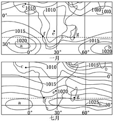 (1)图中c地一月的气压值是 ,七月的盛行风向是 。(2分)