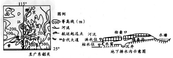 2、综合题 下面分别为赣州古城和该城地下排水沟示意图。