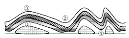 (1)图中①②③④四处,在地质构造上属于背斜的是________。在野外考察中,有时会见到背斜成谷现象,其原因是________________。根据地层的相互关系确定背斜的方法是________________。③处的地形属________山地。