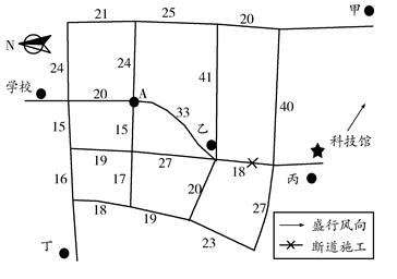 3、单选题 下图为某城市主要道路分布图,标注数字表示道路长度。读图回答(1)~(3)题。