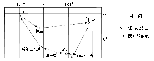 1、综合题 2014年6月9日,中国海军首次派出包括驱逐舰、护卫舰及医疗船等在内的海军舰队参加环太平洋军事演习,经数月航行后,其中的医疗船于9月29日驶回舟山。下图为医疗船航行路线示意图。读图,回答下列问题。(12分)