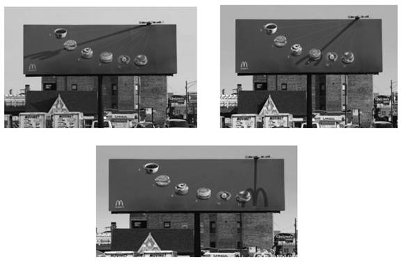 4、单选题 一些有创意的广告有时与地理现象密切相关。下面三张照片是麦当劳公司在芝加哥(420N,880W)一天中3个时间点拍摄的户外广告牌。右下图为照片的侧视效果图。该广告房顶水平放置着一个大叉子,叉子的倒影是麦当劳的标志。每天早上6点到11点,根据叉子在阳光下的影子位置的变化告诉大家什么时间吃什么麦当劳的产品。请仔细阅读照片中的地理信息并回答下列各题。