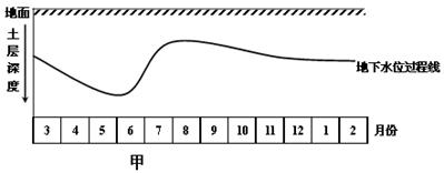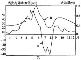 (2)乙图A、B两条曲线中,反映表层土壤含盐量季节变化曲线的是____________。该平原有不少低洼易涝地,对其治理的成功模式是___________________________。(2分)