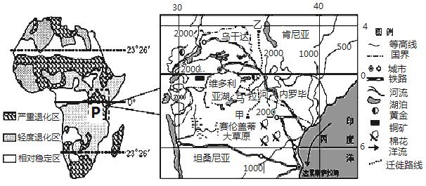 (3)P区域主要在东非高原,由资料图分析:近年来非洲人口增长快,经济水平低,粮食不足,过度开垦,发展种植业,使土地退化严重;高原上开矿(铜、黄金等),破坏地表植被,使土地退化;修建铁路等交通设施,草原退化;城市用地不断扩大,造成生态环境破坏。