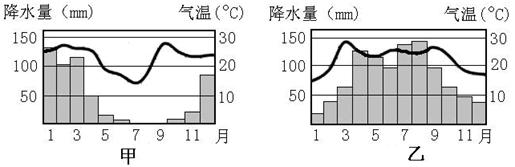 材料二图中甲、乙两地气温、降水分布图