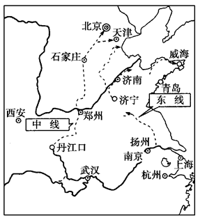 材料二?南水北调中线工程从汉江上游的丹江口水库取水,利用地势的自然落差,全长1 241千米建设全立交、全衬砌引水渠道,穿越沿线各水系,每年将145亿立方米的水送到华北平原和黄淮地区,最后到达天津、北京。
