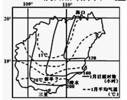 【材料三】海南岛1月多年平均等温线及日照时数等值线图