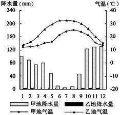 (1)降水:甲地降水多,主要在冬半年;乙地全年降水少(2分)。气温:乙地全年高于甲地;乙地年较差大于甲地(2分)