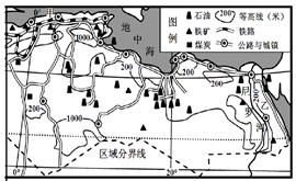 点评:本题难度适中。以北非简图和图中甲、乙两地气温和降水统计图为材料,考查了学生对北非气候、发展农业的有利自然条件、该地区城镇与交通线分布差异及原因等相关知识的掌握情况。