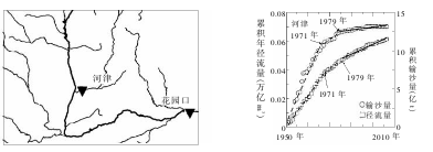 2、单选题 该图为黄河中游某区域水系图及河津水文站1950—2010年部分统计资料图,读图,完成问题。