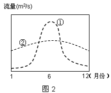 (3)图2为①②两地水文站测得的河流流量变化曲线,请说明湖泊对该河流径流量的影响是___________