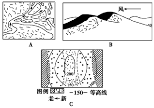 (3)根据等高线数值判断,C图中地形是五种基本类型中的______________;根据岩层露头的新老关系