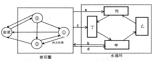 3、综合题 下图表示岩石圈与水循环的关系。①②③表示三大类岩石,甲、乙、丙、丁为海陆间循环各环节,箭头a、b、c、d为岩石圈与水循环各环节的作用,读图回答下列问题。(10分)