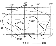 5、单选题 下图为某海域表层海水等温线和某种天气系统出现频率分布图。读图回答题。