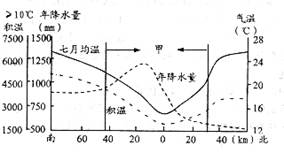 4、单选题 下面是以我国境内某地(图中0千米处)为中心沿108°E所作的气候统计图。据图判断下列小题。