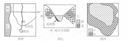 3、单选题 图甲为某沿海地区,图乙是沿图甲中的M地所作的河谷剖面图(剖面形成与地转偏向力有关),图丙为图甲中湖泊水位的最大与最小变化情况。读图完成下列问题。