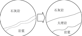 本题考查地壳物质循环,三大类岩石的形成。地球内部的岩浆,经过冷却凝固形成岩浆岩,岩浆岩受流水、风、冰川、海浪等的侵蚀、搬运、堆积作用,形成沉积岩。同时,这些已生成的岩石,在一定温度和压力等作用下发生变质,形成变质岩。各类岩石在地壳深处或地壳以下发生重熔再生作用,又成为新的岩浆。图中石灰岩为沉积岩,沉积岩接近岩浆部分受高温高压条件影响,变质称为变质岩大理岩。所以该图体现的变质岩的形成过程。所以本题选择B选项。