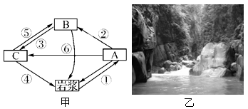 【小题3】乙图峡谷形成主要是流水侵蚀形成,属于外力作用。与图甲中的②相同,B对。①是冷却凝结作用,A错。③是变质作用,C错。④是高温熔化,熔融作用,D错。
