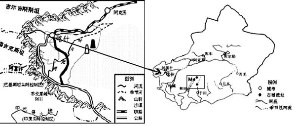 (1)山前河流流出谷口,地势平缓,流速减慢,摆脱了侧向约束,其携带物质便铺散沉积下来,形成扇形堆积体,该地貌称为冲积扇(洪积-冲积平原);根据材料一,可看出喀什位于塔里木河上游,所在地形区为塔里木盆地;该地区为西北内陆地区,降水稀少,风力较大,所以该地形区内部主要以风力堆积地貌为主。