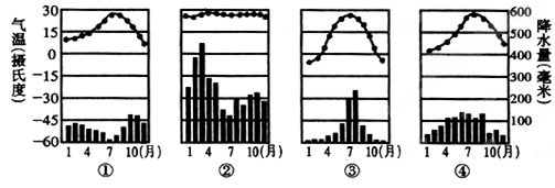 D.温带海洋性气候、热带季风气候、温带季风气候、地中海气候