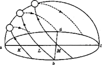5、单选题 下图是北半球某地二分二至日太阳视运动示意图,K、L、M三条曲线为二分二至日太阳视运动曲线。读图回答1—2题。