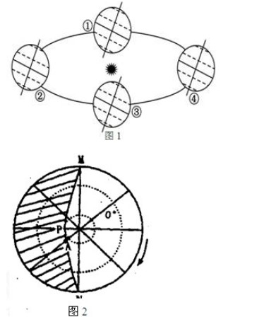 第(1)题,由图可知:地球自转方向为顺时针,说明图2是以南为中心的半球示意图,图中弧MP上的点正有黑夜进入白昼,是晨线。