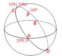 1、单选题 读某晨昏圈图,CAD为晨线,CBD为昏线,A为(20°E,0°),C为(70°W,70°N)。完成下列问题。