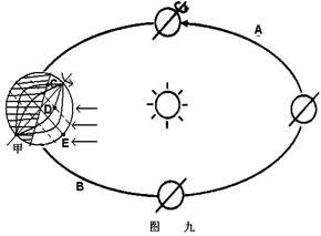 2、综合题 读图九:太阳公转(二分二至)示意图,完成下列各题。(9分)
