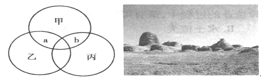 5、单选题 该图表示大气圈、生物圈和岩石圈的某种关系,a为甲、乙间相互作用,b为甲、丙间相互作用。图为我国内陆某地自然景观。据此回答29-30题。
