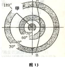 1、单选题 读“以北极为中心的局部大气环流分布示意图” 图13 (AB为晨昏线,阴影部分为气压带)。