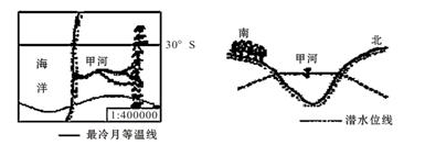 小题2:由图中“河流剖面”示意图可知:甲河为河流水补给地下水,故甲河处于汛期,为冬季。据此推知甲河流域此时盛行西北风,受盛行西风带控制,夏季才受副热带高压带控制,形成炎热干燥的天气。?