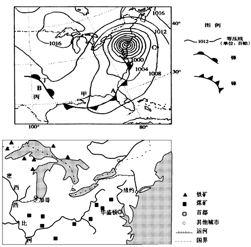 (3)飓风“艾琳”所属的天气系统是________,此时图中C地的风向是_______ 。(4分)