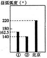 与②的昼弧与180?都相差40?,所以是分布在南北半球的纬度相等;①与180?相差小于40 ?,所以纬度低于北京和②。选择D项。