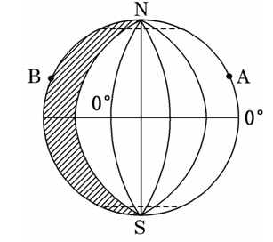 4、综合题 图中阴影部分表示夜半球,A、B两地均处在30°N。读图,回答下列问题。(14分)