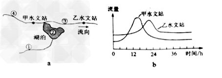 1、单选题 下图示意流域水系分布(a )和该流域吧、内一次局地暴雨前后甲,乙两水文站观测到的河流流量变化曲线(b ),读图完成1-2 题。