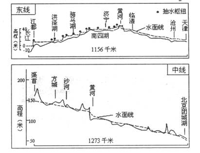 3、单选题 2014年12月12日南水北调中线一期工程正式通水。下图为南水北调工程东线及中线输水干线纵断面示意图。读图完成下列小题。