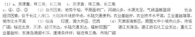b、京津冀、长三角、珠三角区域经济发展条件比较:具有明显资源优势的是?;土地资源最稀缺的是?;最具有吸引外资能力的是?。