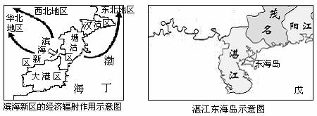材料三:滨海新区位于天津东部临海,面积2270km2,拥有153千米的海岸线。它将聚各项优势,立足天津,辐射“三北”,面向东北亚,努力打造成现代化加工制造基地和国际物流中心,成为天津现代化国际港口大都市的标志区和生态宜居海滨城市。“湛江钢铁”是广东实现重化工业产业升级的重要一环。它选址在湛江东海岛,东海岛面积是286km2,该处拥有建设国内最好的深水港条件,可同时通航两对30万吨级以上的货轮和50万吨级的油轮。