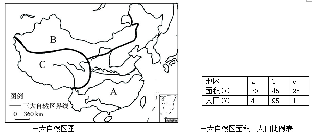 2、综合题 读下面材料、三大自然区图及其面积、人口比例表,回答问题。(11分)