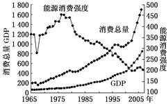 2、单选题 能源消费强度是衡量一个国家能源利用效率的重要指标,它是指产出单位经济量所消耗的能源量,强度越低,能源效率越高。读1965~2005年中国能源消费与GDP变化关系图,回答问题。