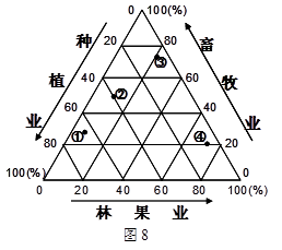 小题3:图8中①点表示当前甲河流域农业产值比重。为缓解当地的生态危机,拟调整该地区的农业产业结构,其中合理的规划方案是 ( )