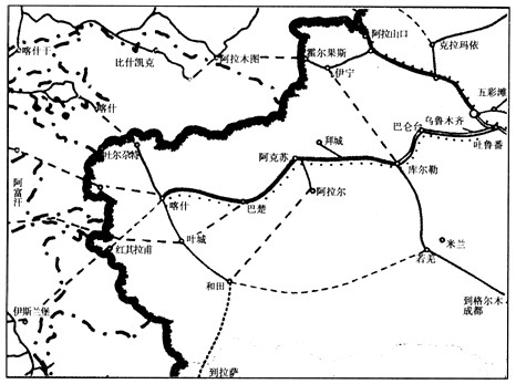 ? 下图是喀什所在地区规划中、建设中和已建成的部分交通线图。虚线表示规划中的交通线,实线表示建设中和已建成的交通线。有人形容说,俯瞰新疆交通图,可以看到一条西延至阿拉山口出国境的铁路和一条起于吐鲁番向西南蜿蜒至喀什的钢铁大动脉,在160万平方千米的新疆大地上画出了一个曲折的“人”字。2010年11月6日喀和铁路(喀什至和田)全线铺通。