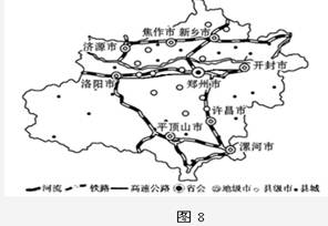 3、单选题 中原城市群是以郑州为中心,洛阳为副中心,开封、新乡、焦作、许昌等地区性城市为节点构成的紧密联系圈,是我国中部崛起的重要经济增长极。图8为中原城市群示意图。据此完成21-22题
