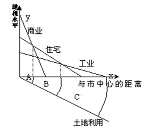 (2)住宅区是城市功能区中最为广泛的一种土地利用方式。图中A付租能力最强,为商业区。一般布局在地租最高的市中心和地租次高地区中的道路相交处。