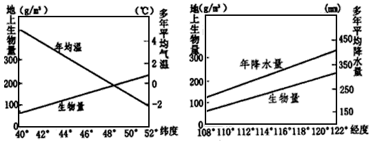 1、单选题 生物量一般是指生物在某一特定时刻单位空间的个体数、重量或其所含能量。下图示意我国某区域地上生物量、年均温和年降水量随经纬度的线性变化。读图回答以下两题。