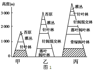 小题1:纬度越高,自然带数目越少,且可根据基带的自然带来判断其所处的纬度。根据甲地的山麓自然带为针叶林;乙地的山麓自然带为落叶阔叶林;丙地山麓自然带为常绿阔叶林判断三地的纬度高低。