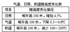 (1)从“日照、气温、积温随高度变化表”中,可以看出农业生产的三种指标参数随高度发生变化,请说出日照、气温的变化趋势并简要说明原因。(4分)