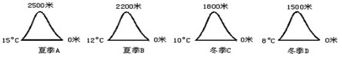 本题解析:永久性冰雪的山峰在夏季时雪线的最低温在0°C以下。根据温度随高度的变化,每上升100米气温下降0.6°C,A图中0米为15°C,到顶部2500米处刚好是0°C;B图中0米为12°C,0°C的高度在2000米,2000米以上为永久性冰雪的山峰。因为C、D为冬季,情况不好判断。